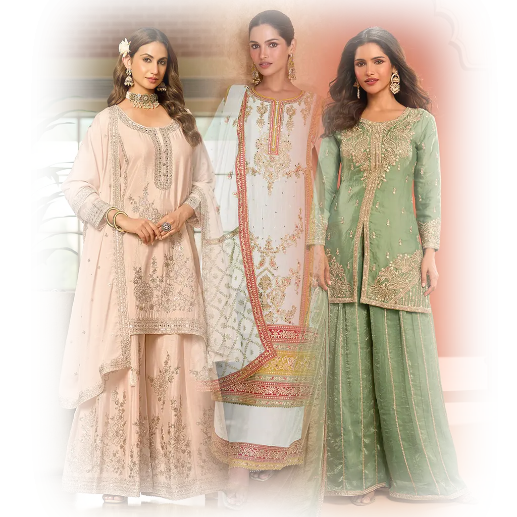 Women’s Stitched Embroidered Gown Suit Set – 3 Pcs in Katan Silk
